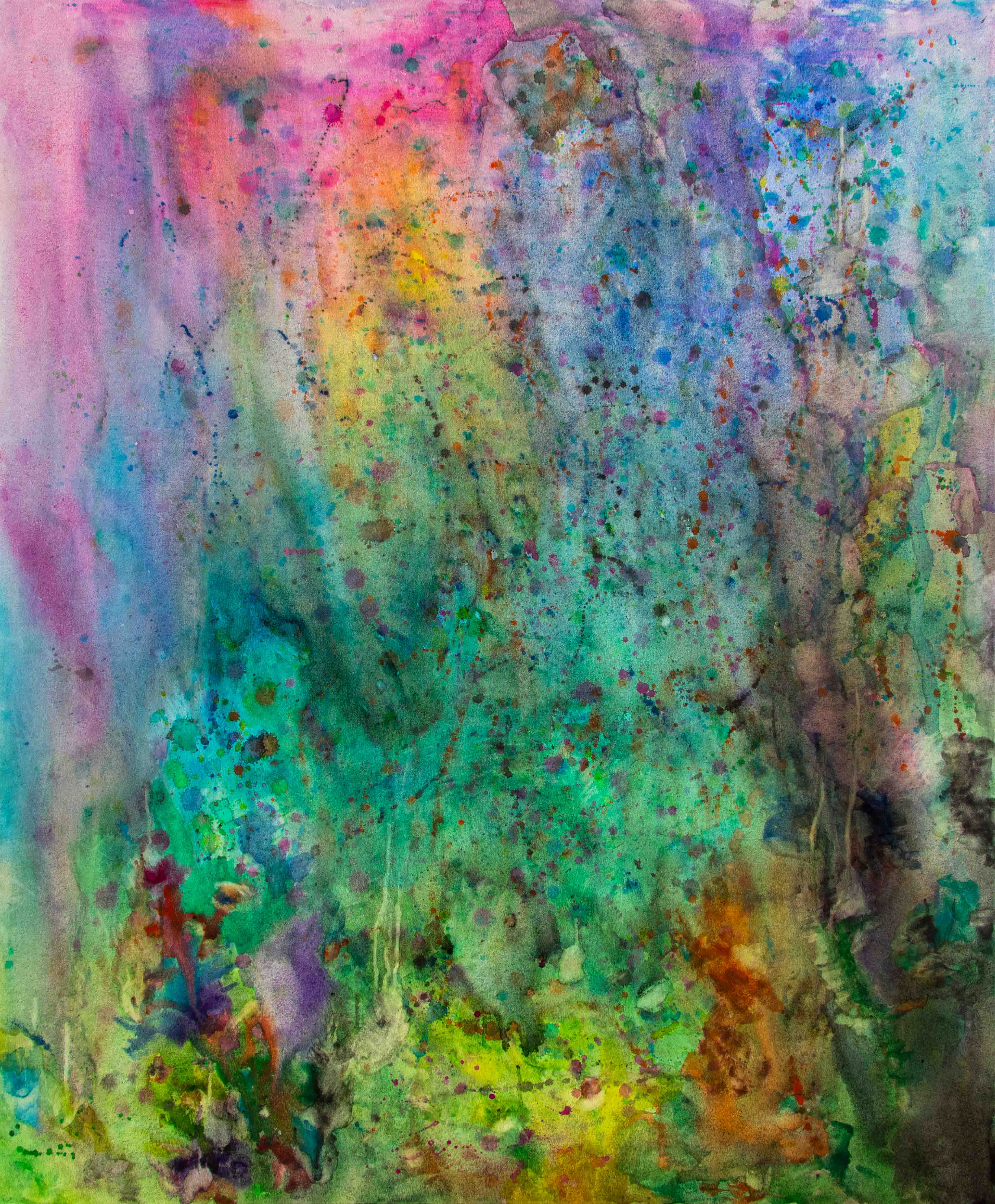 Translucent greens and violets dissolve into atmospheric depth. The painting evokes submerged light and drifting sediment.