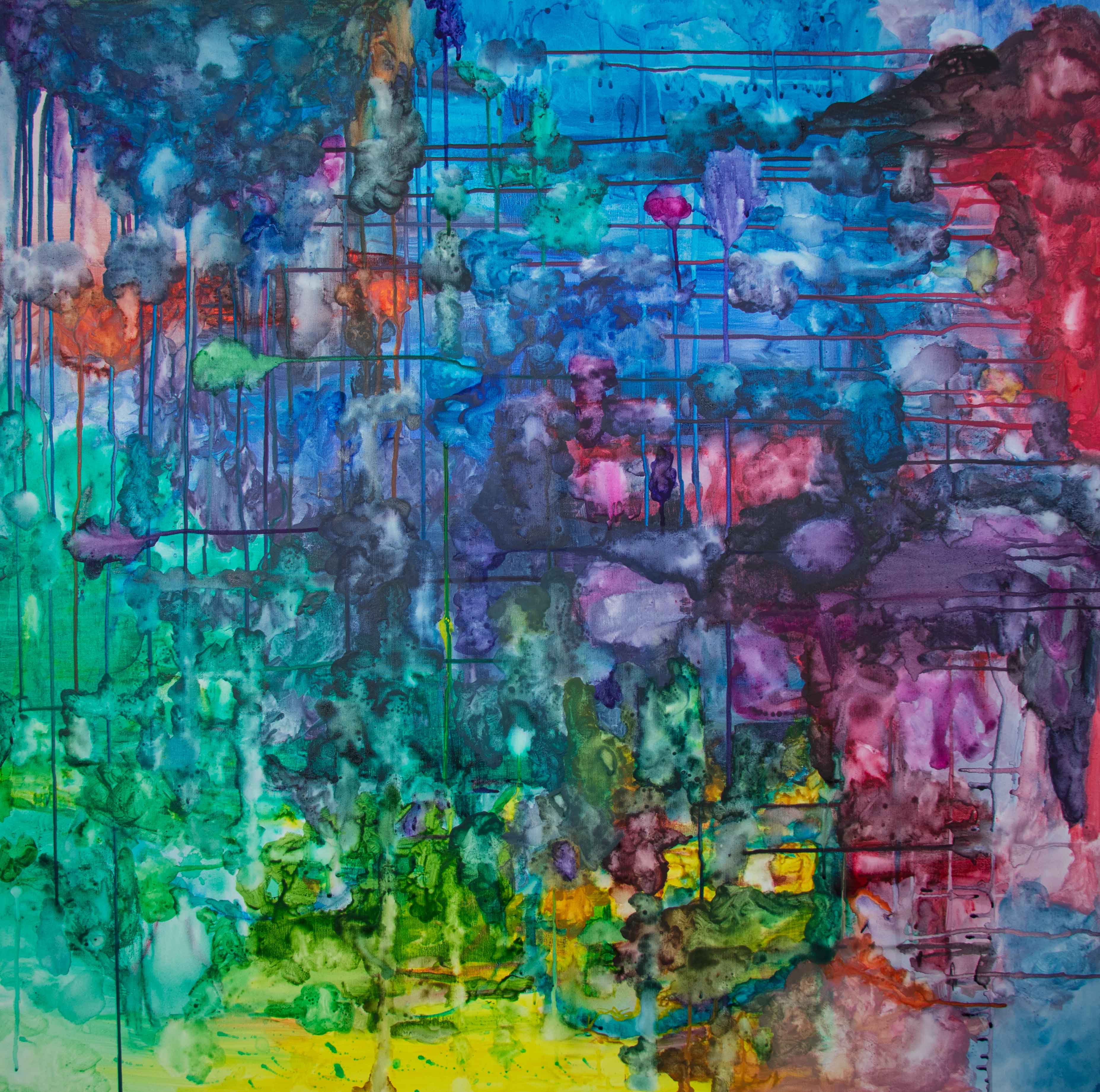 Watercolor blooms and vertical drips chart a fluid landscape. The surface reads as terrain shaped by gravity and flow.